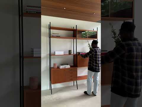 Nuestro mueble de pared vintage quedará genial en tu sala de estar con una hermosa planta de interior, una campana de cristal o algunas deliciosas botellas encima o dentro. Al ser un armario abierto se crea una atmósfera personal. Es la elección perfecta para los amantes de los muebles de diseño vintage y retro. El mueble de pared está fabricado en madera de teca de color marrón oscuro en combinación con barras de metal negras.