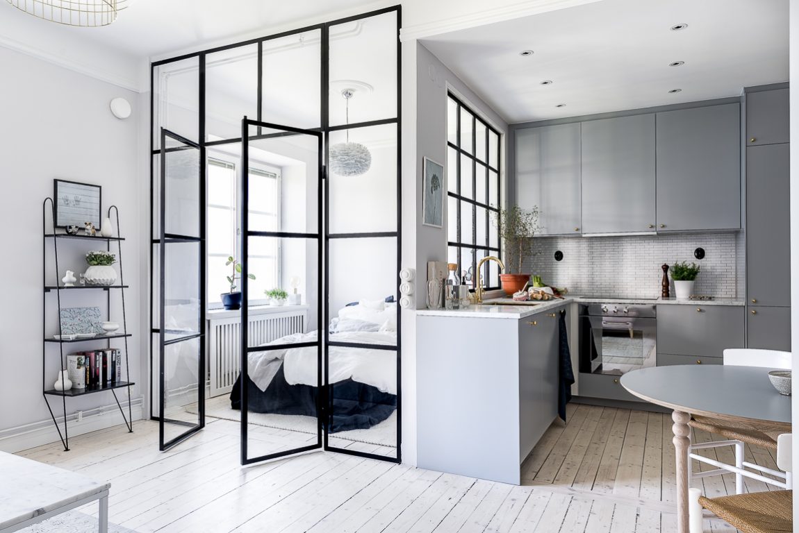 Cela peut sembler un peu contradictoire car dans les petits espaces on a tendance à les laisser ouverts le plus possible. Mais pour créer un effet lumineux et spacieux dans une petite maison, il est important de maintenir la paix et la vue d'ensemble. Comment? En séparant les espaces de vie séparés. Pas avec un mur ou un mur, mais en délimitant des transitions entre différents espaces fonctionnels avec une commode, des plantes, un fauteuil, des lampadaires ou des tapis. De cette façon, vous indiquez clairement que vous passez de votre salon à la cuisine, même si vous êtes assez limité en mètres carrés.