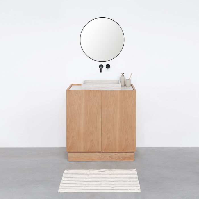 La combinación de la encimera de mármol beige y los muebles de roble le dan al mueble de baño un eterno mirar. Este armario Felix también dispone de mucho espacio de almacenamiento práctico donde podrás guardar todos tus artículos de tocador o toallas.